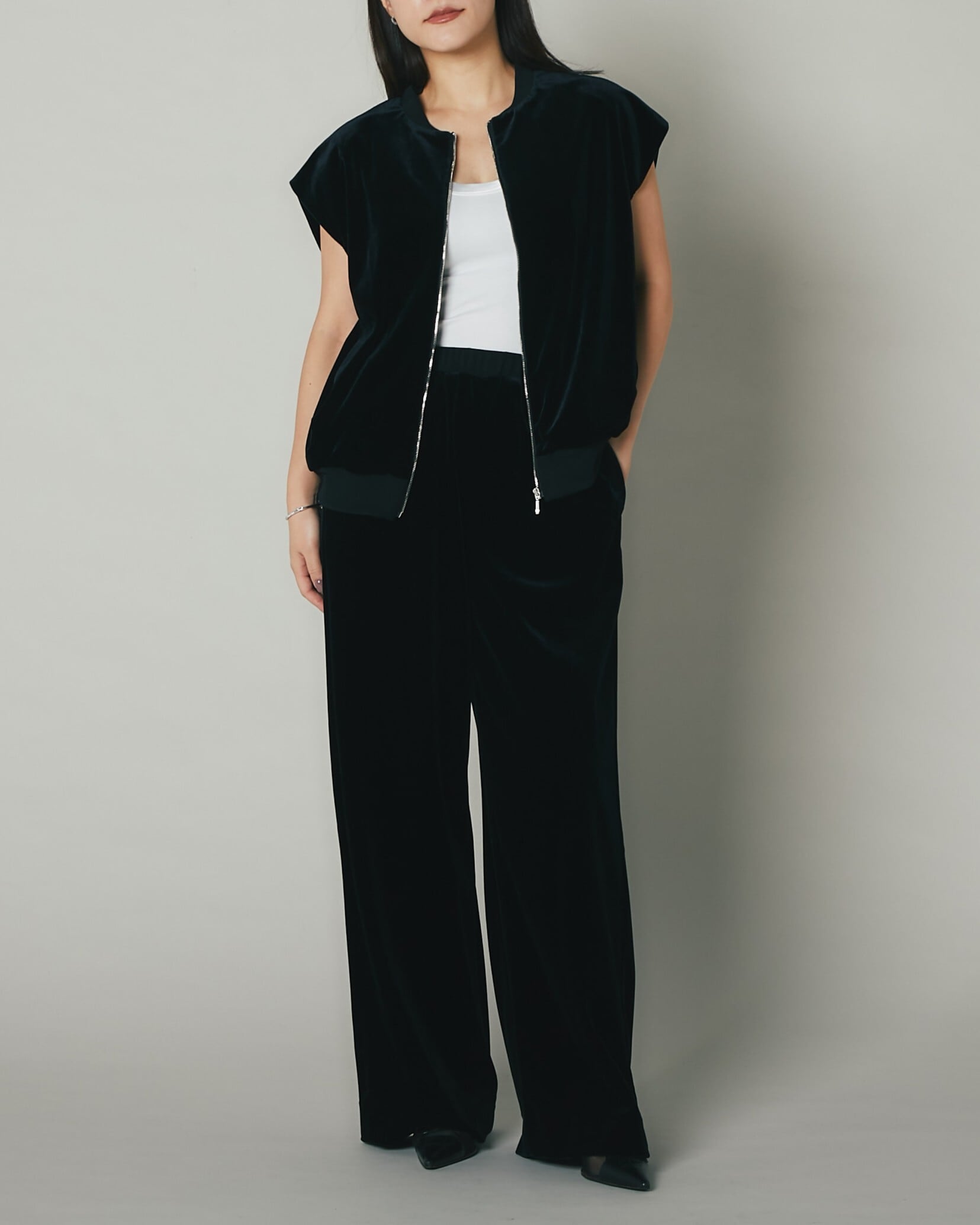 別売りのベロアパンツとのセットアップとしてご着用が可能です。