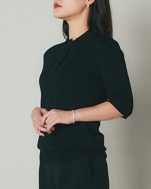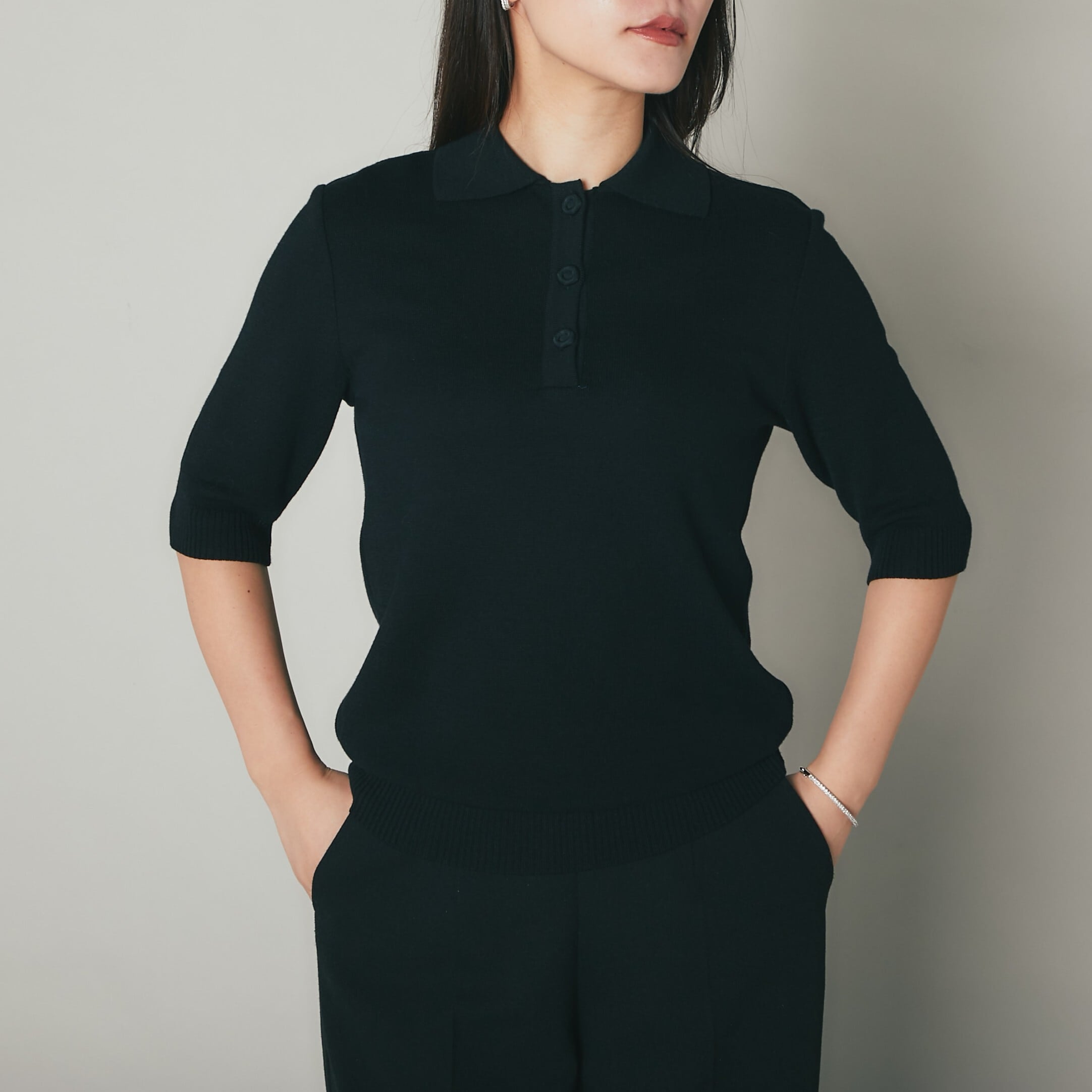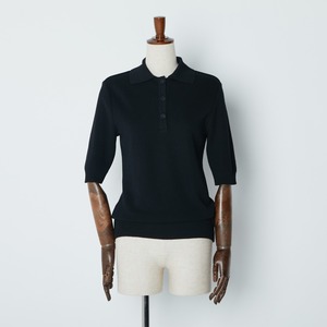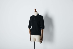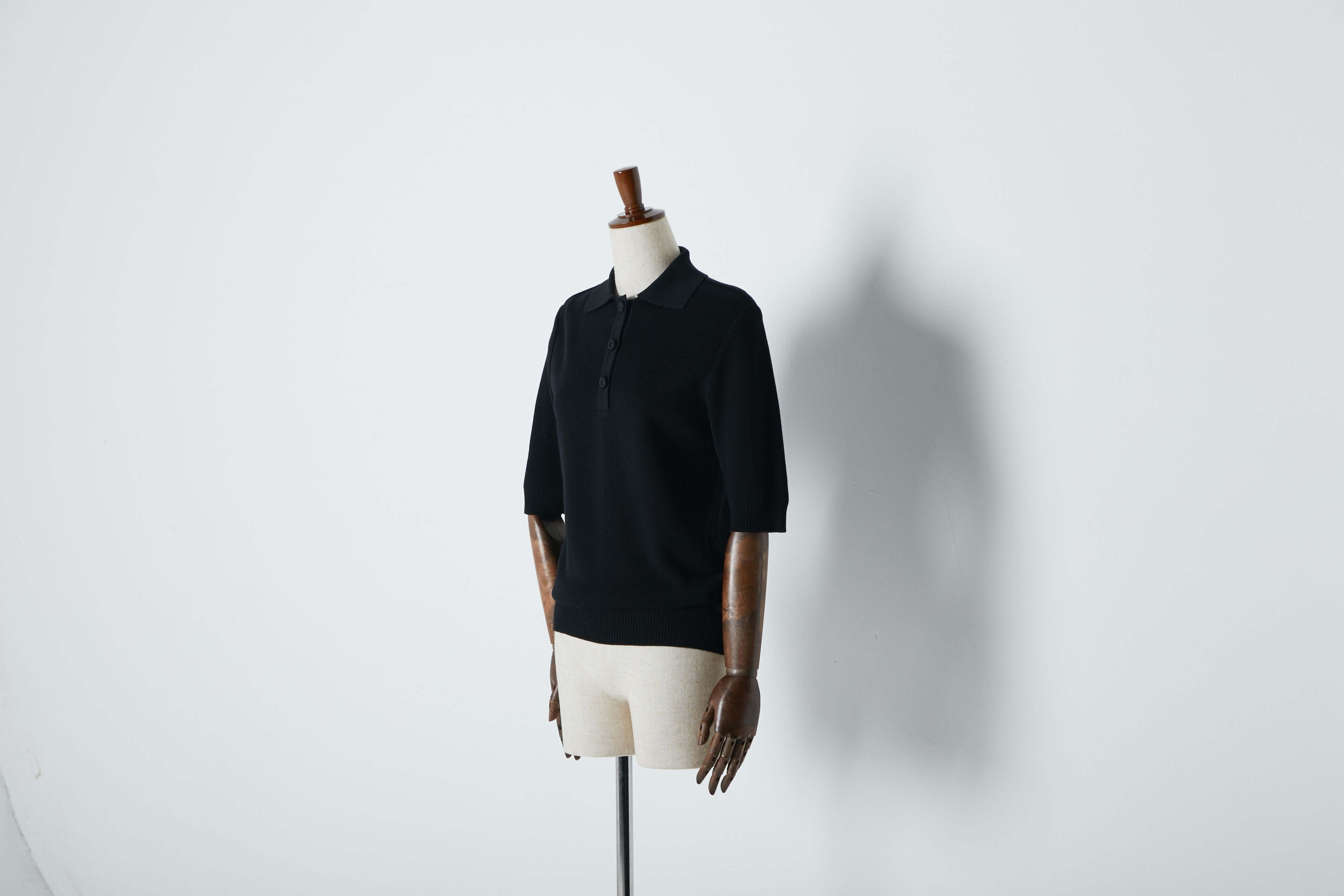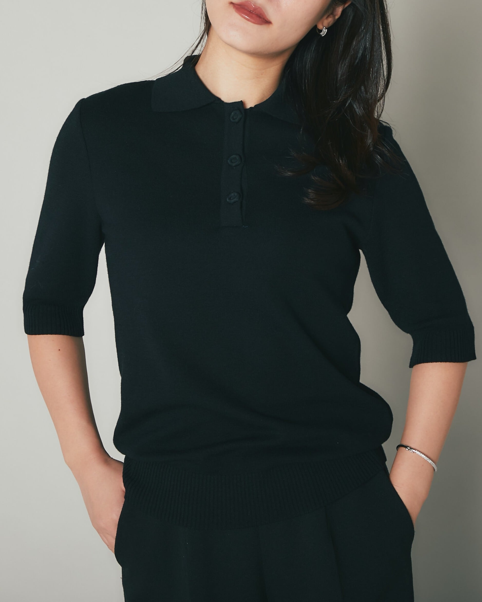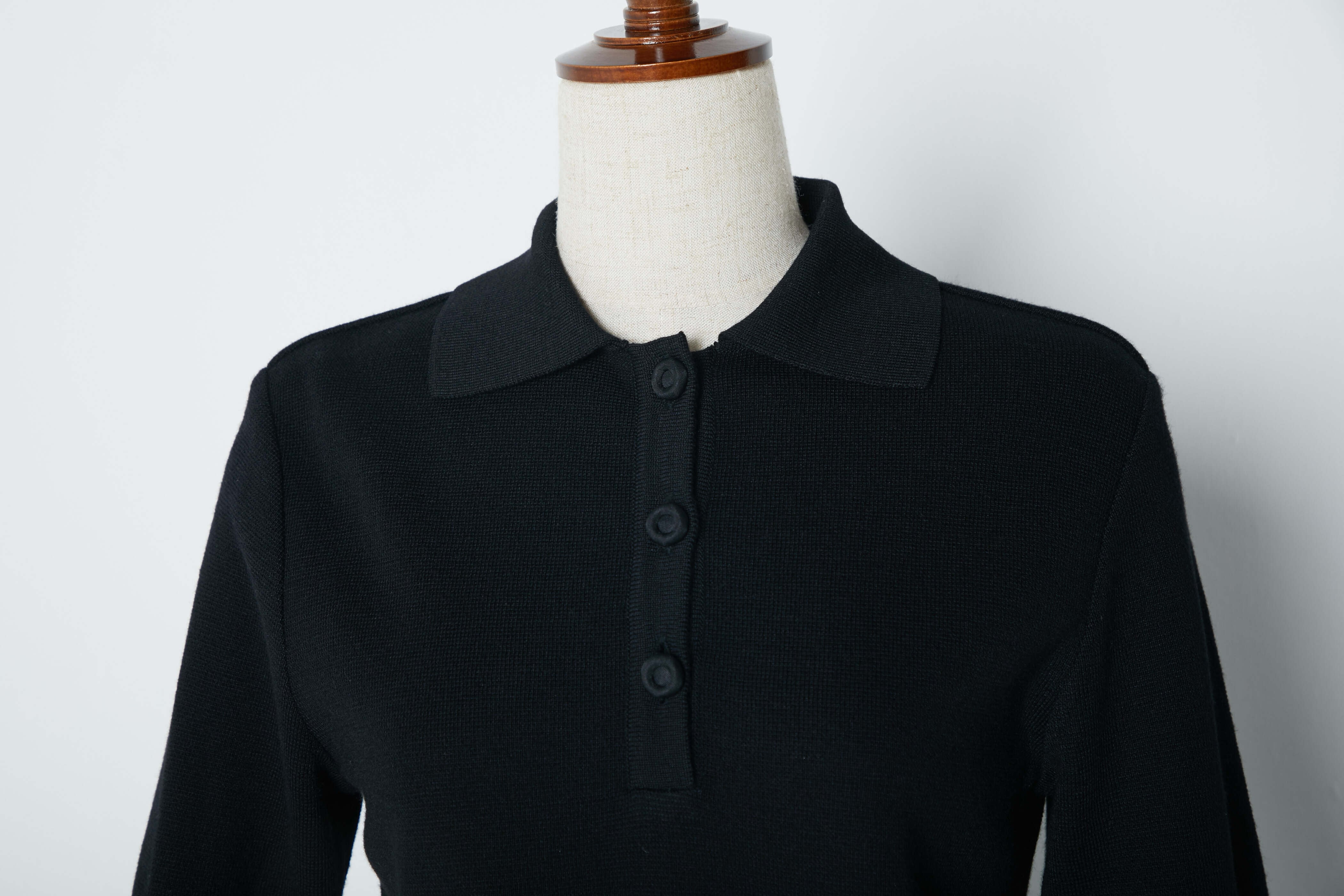 ころんとしたグログランのくるみボタンがユニークなポロニット。