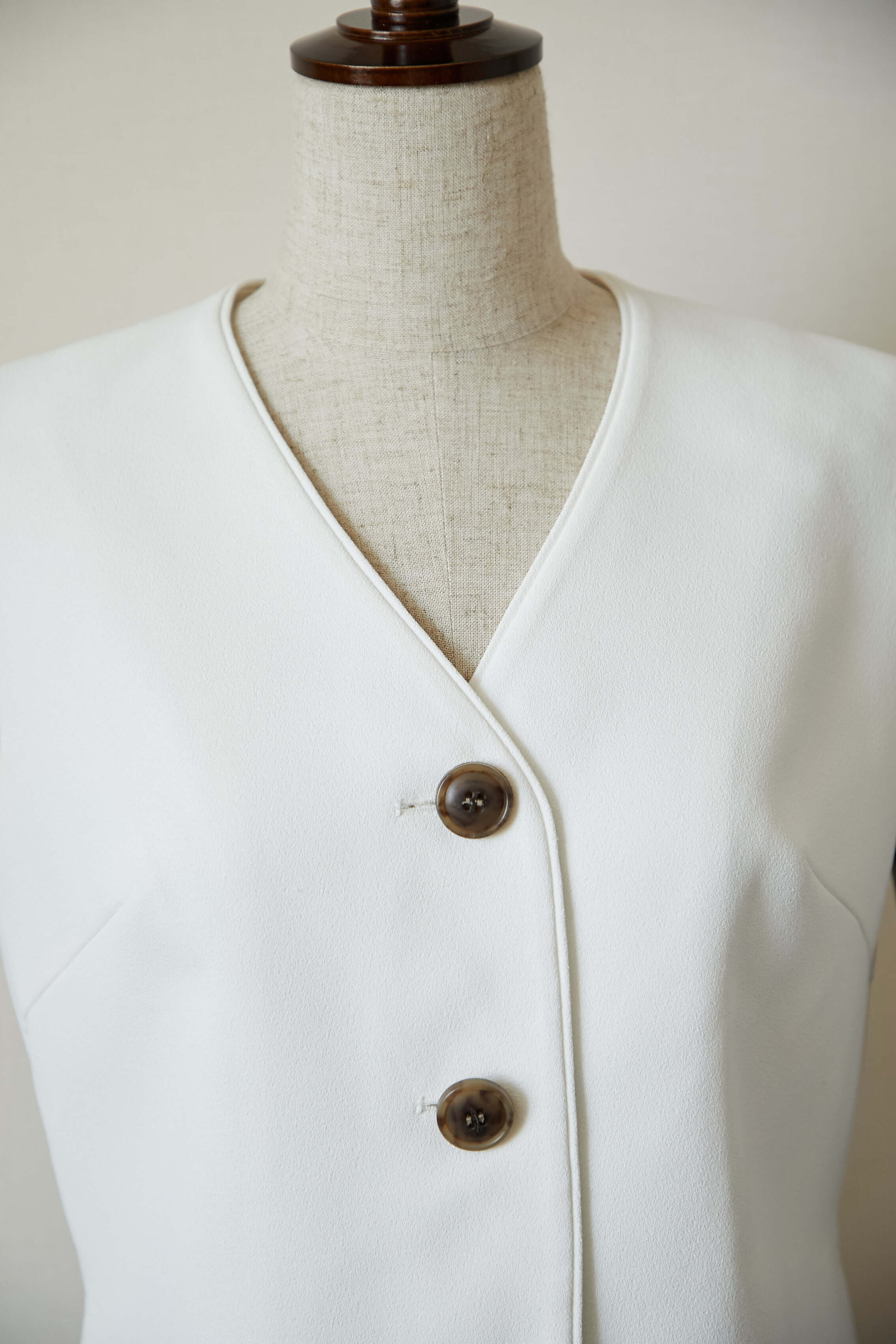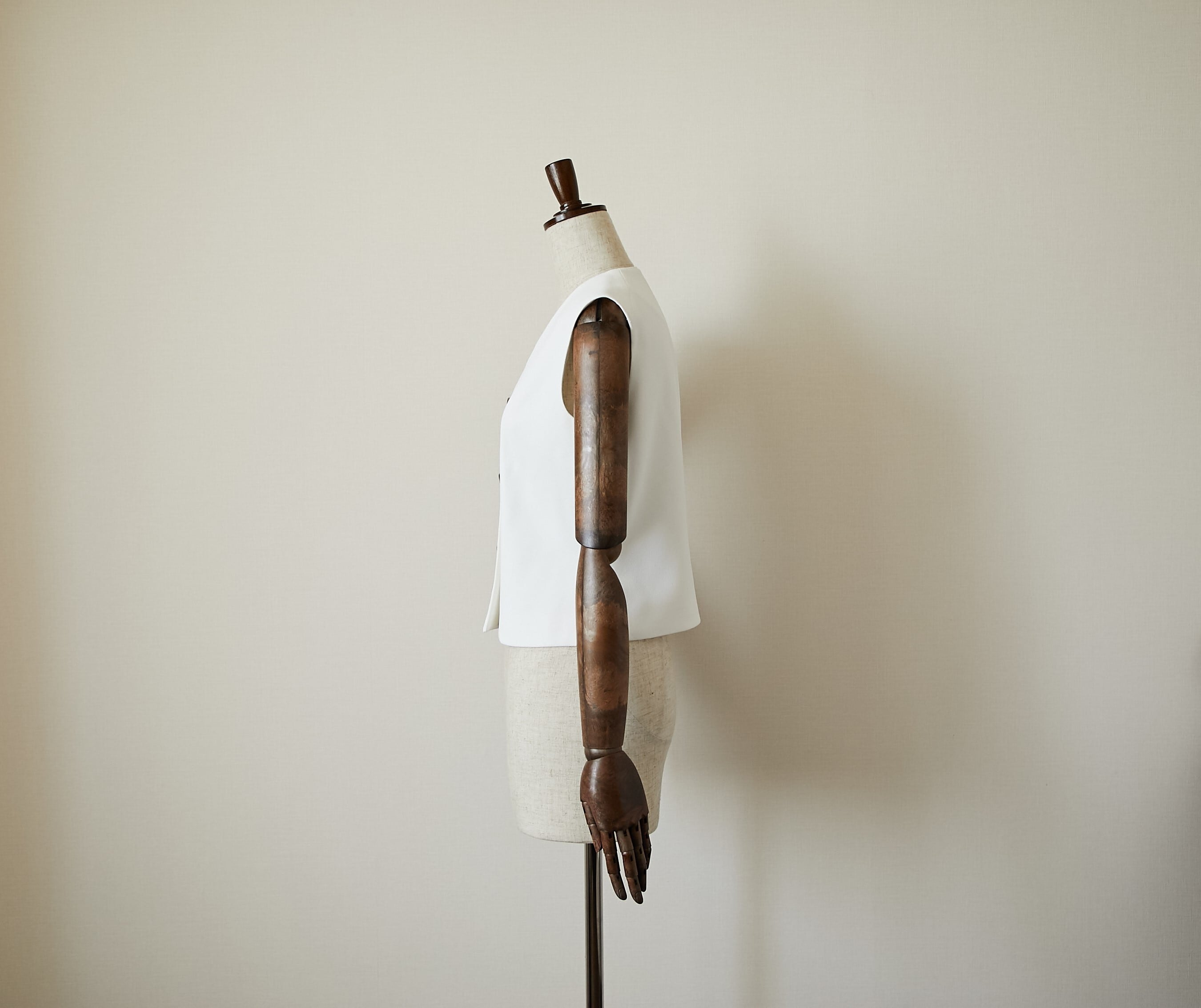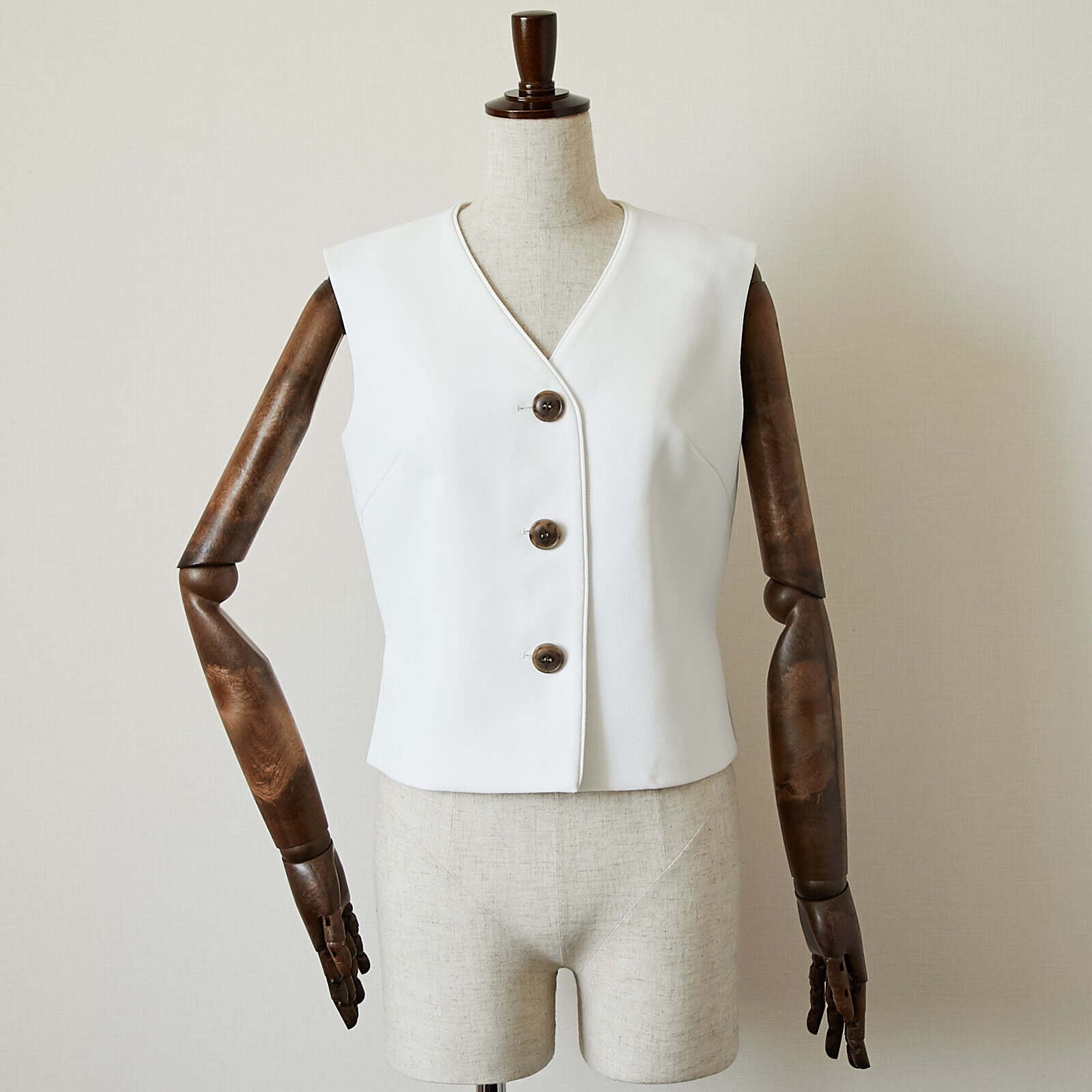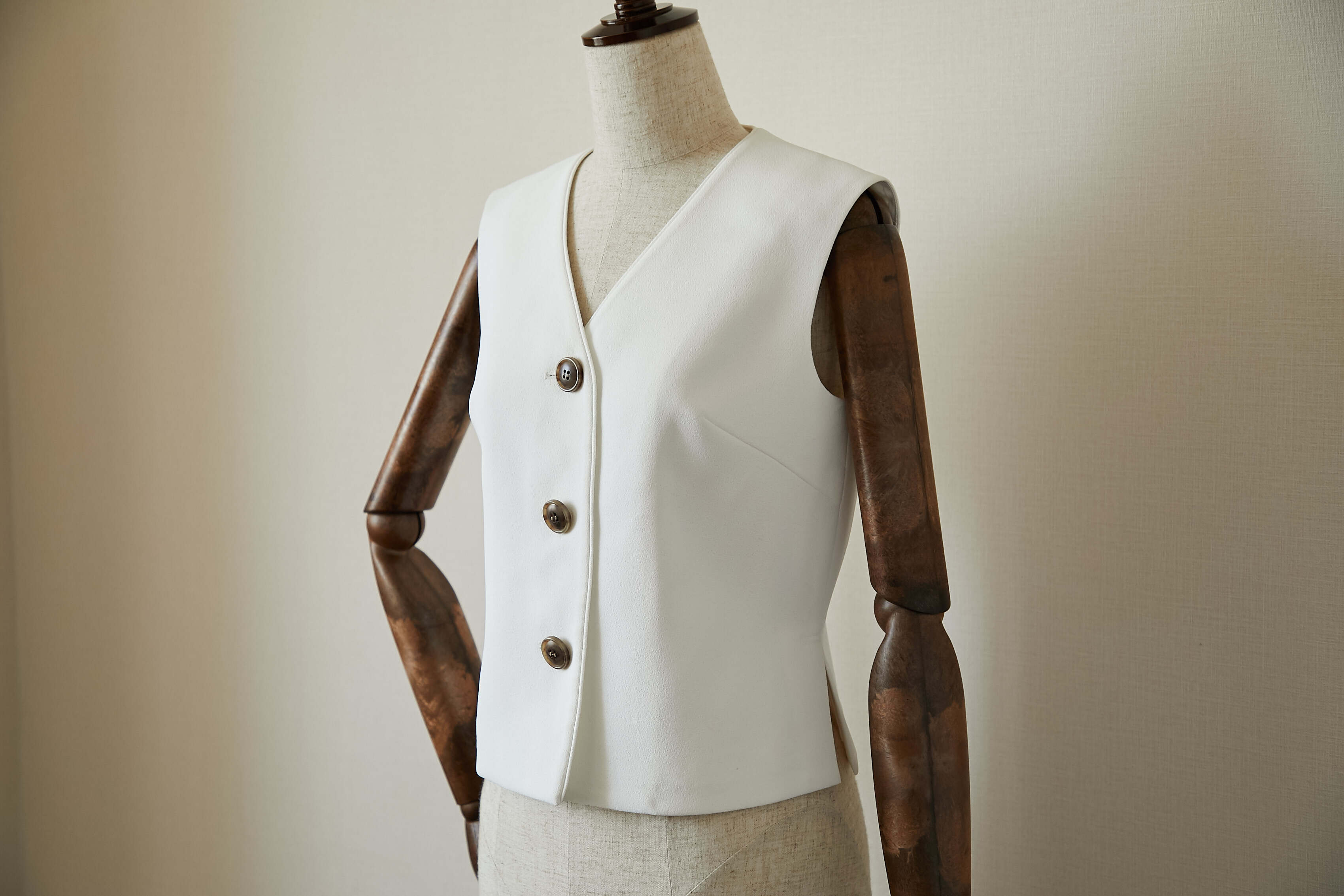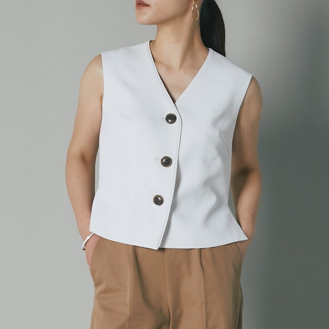 メンズライクなベストトップスを梨地の生地を使って、レディ仕様に製作しました。
