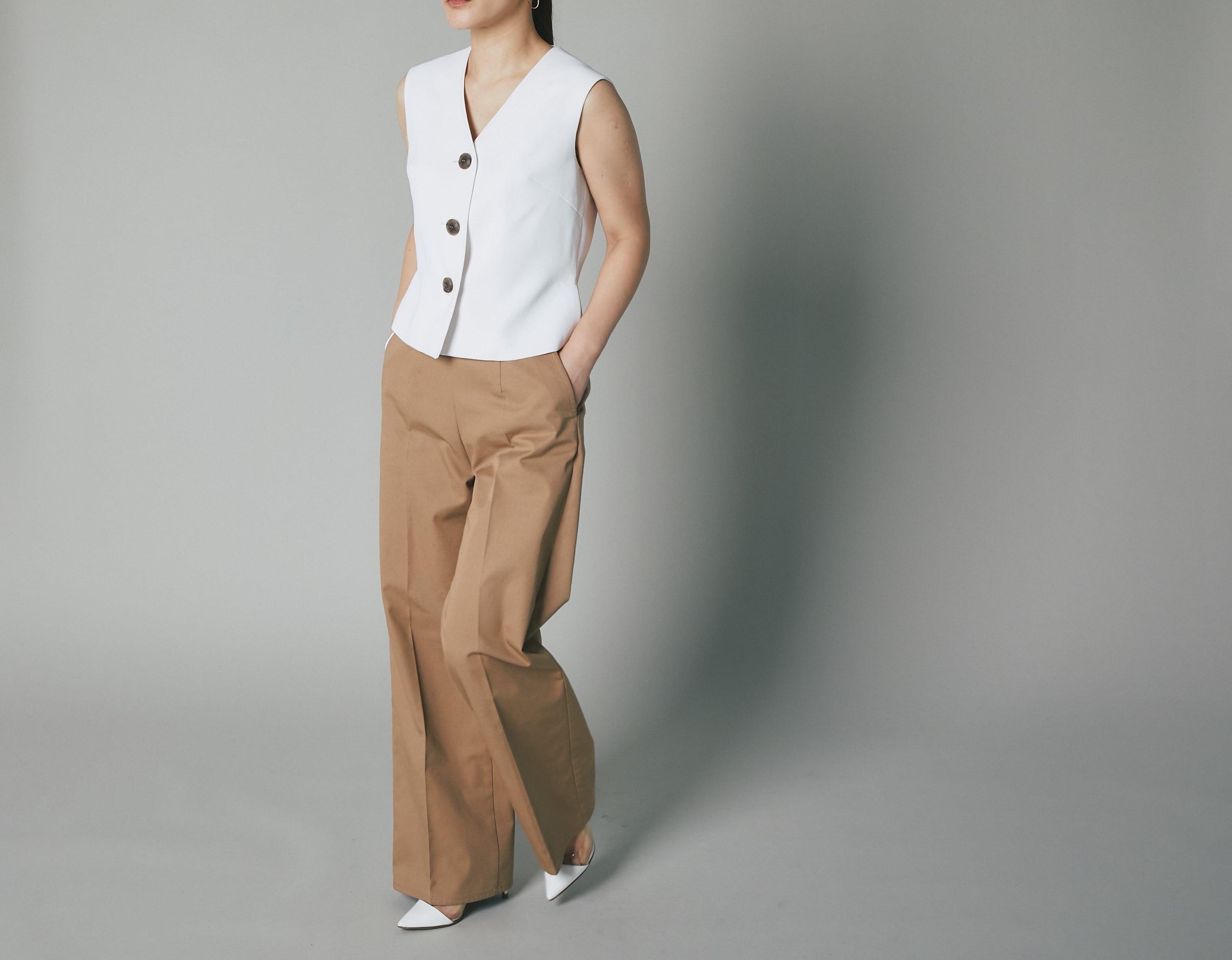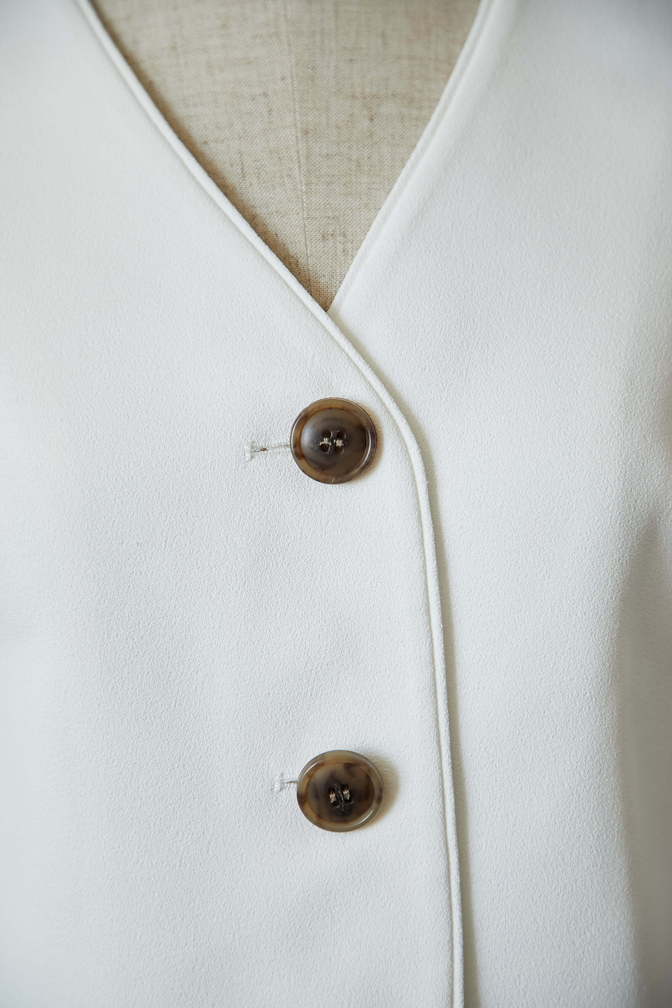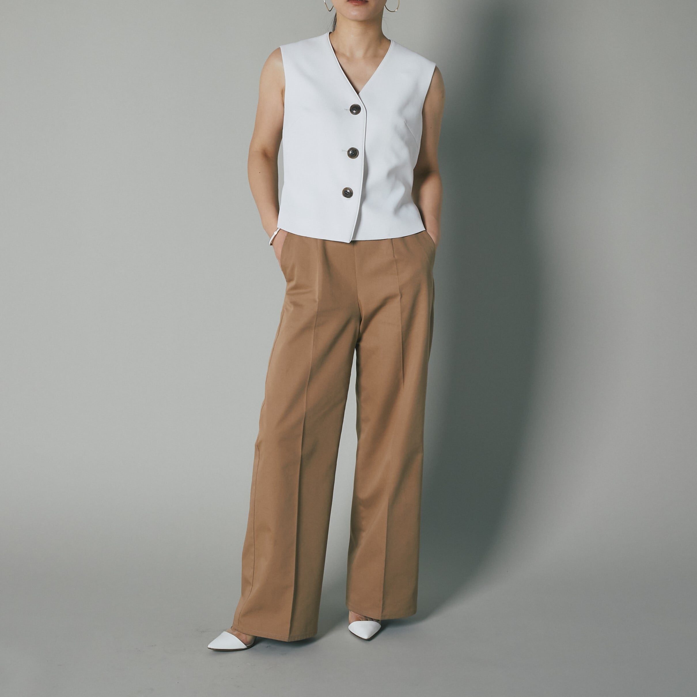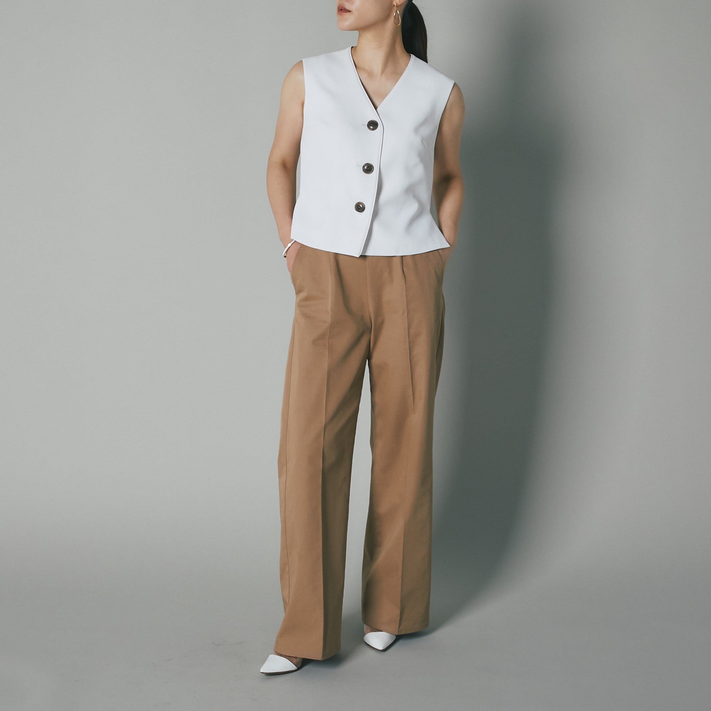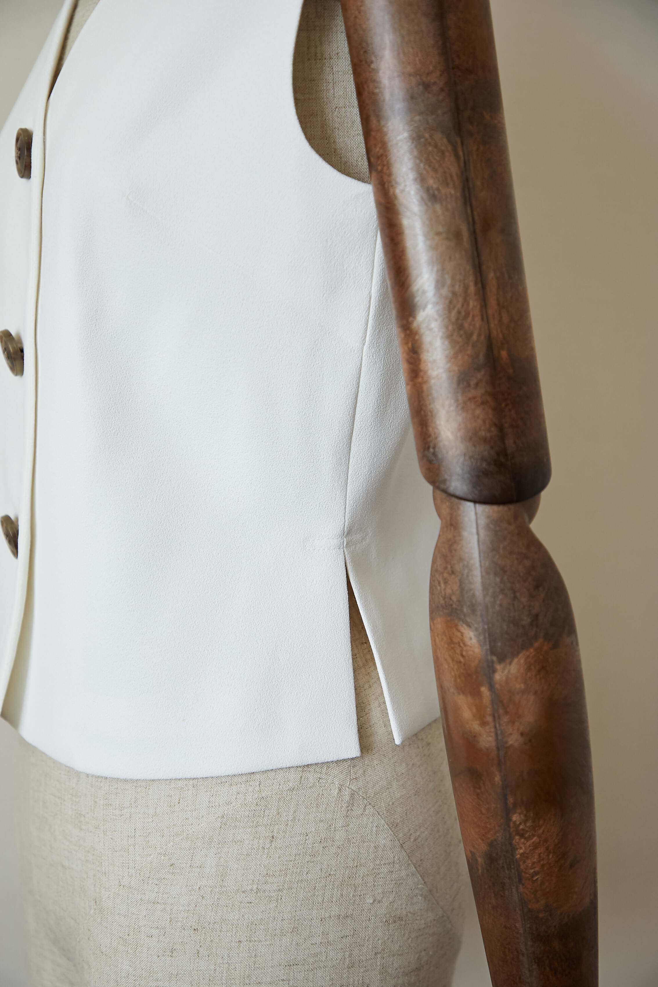 メンズライクなベストトップスを梨地の生地を使って、レディ仕様に製作しました。