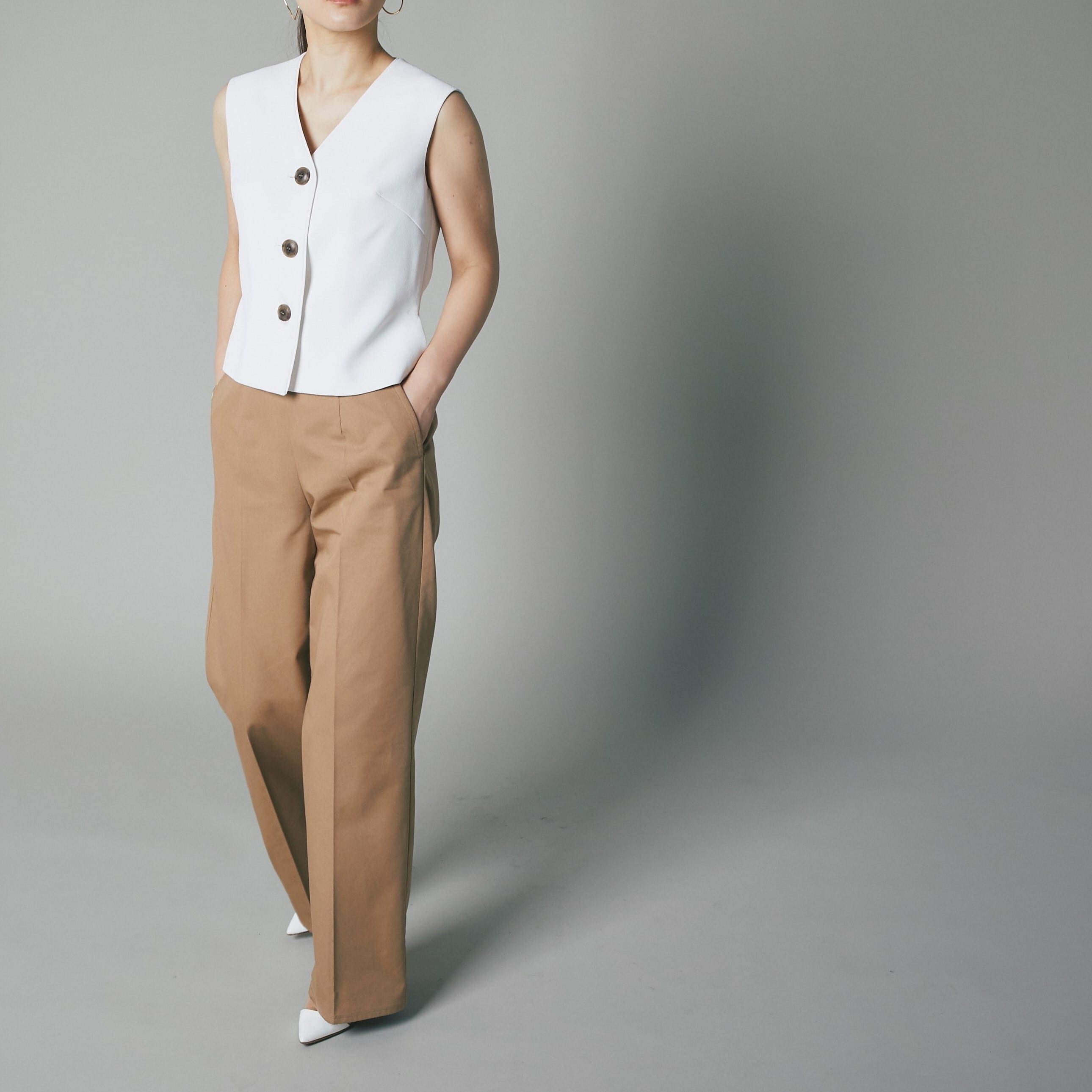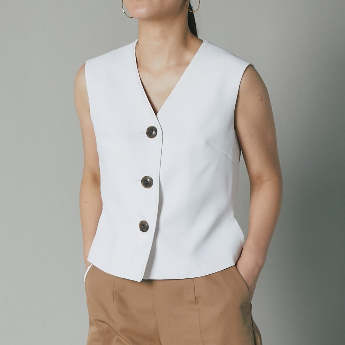 深いVネックには、何も着けずデコルテを綺麗に見せるも良し、お手持ちのジュエリーで首元を華やかに演出して遊ぶも良し。