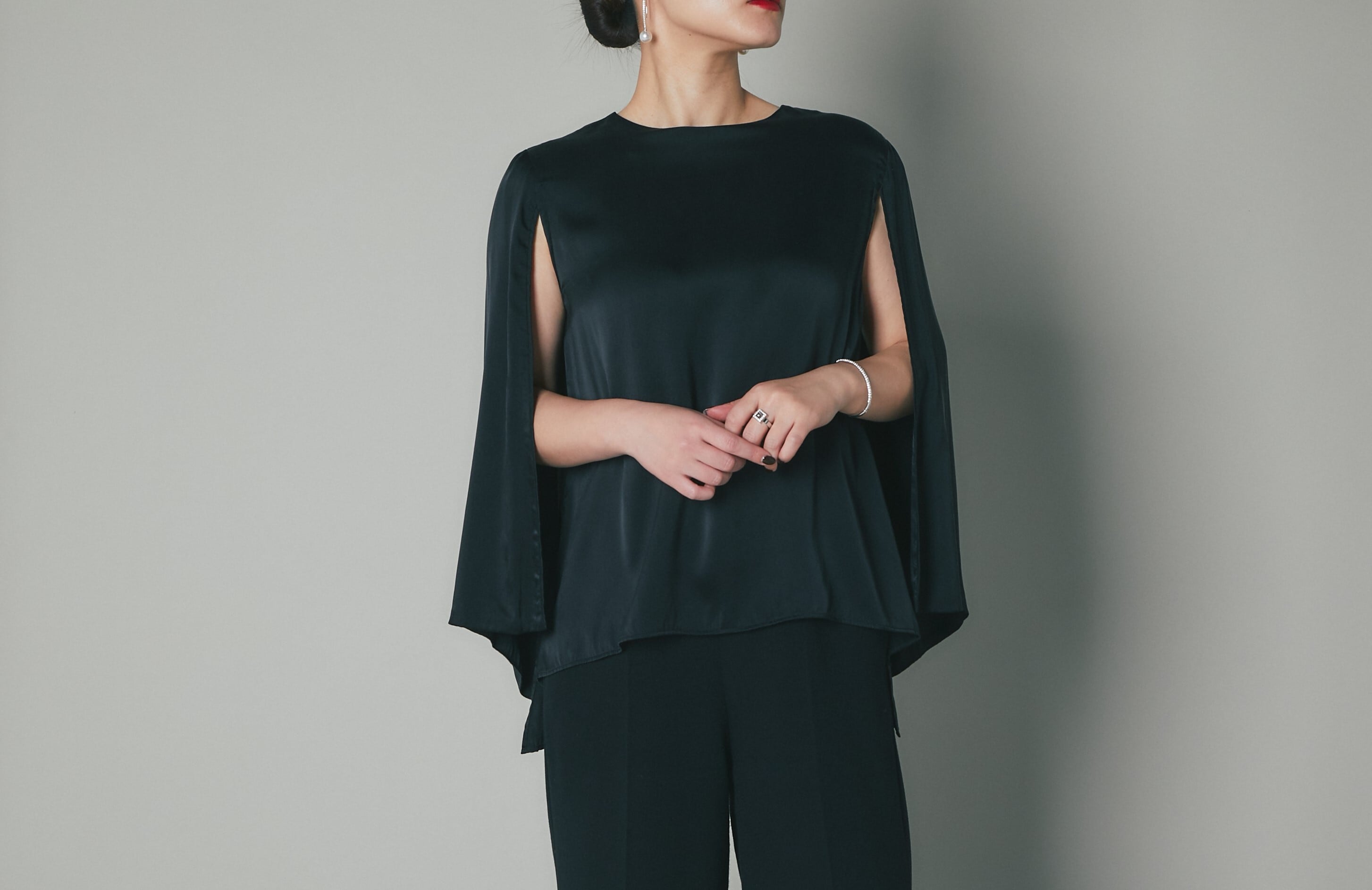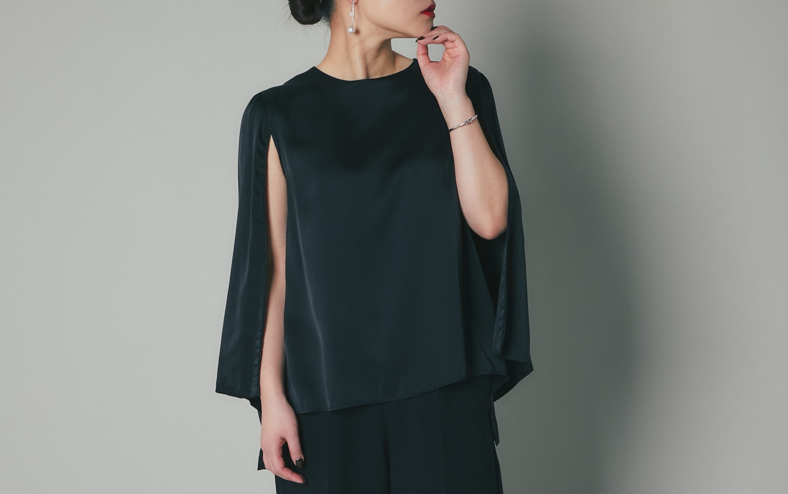 二の腕見せは控えて、ちらりと覗くひじから手のラインを美しく見せてくれます。