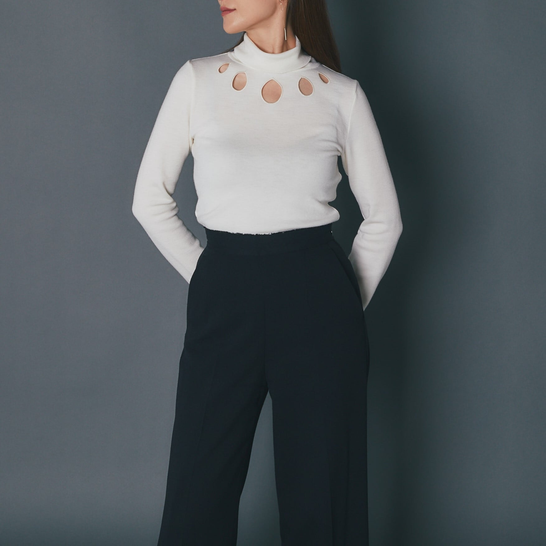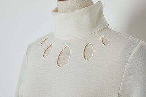 〝横一列に並んでつけるフリージアの蕾〟のようにカッティングを施したデザインニット、Freesia。