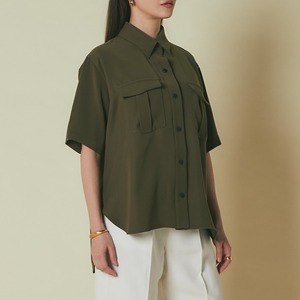 オーバーシルエットのサファリ調シャツを上質でとろみ感のある生地で仕立てました。